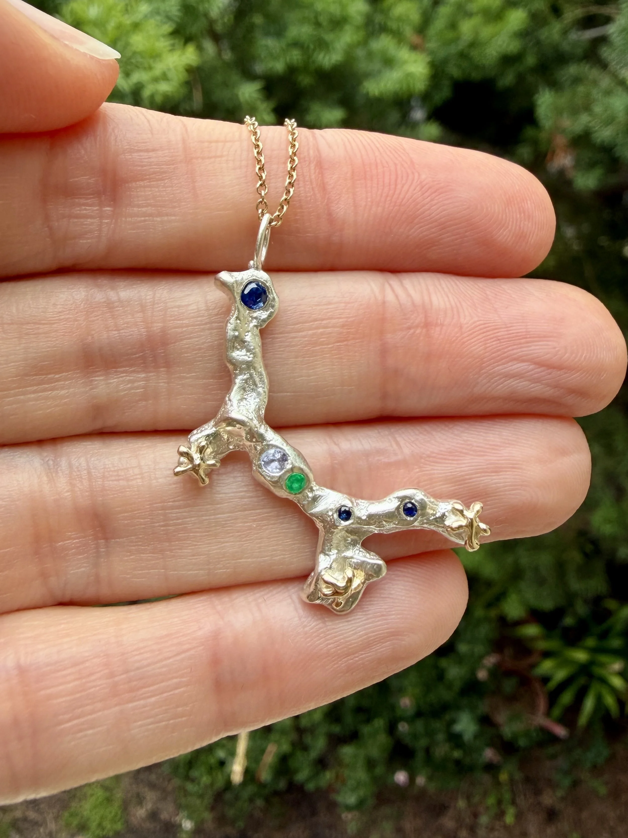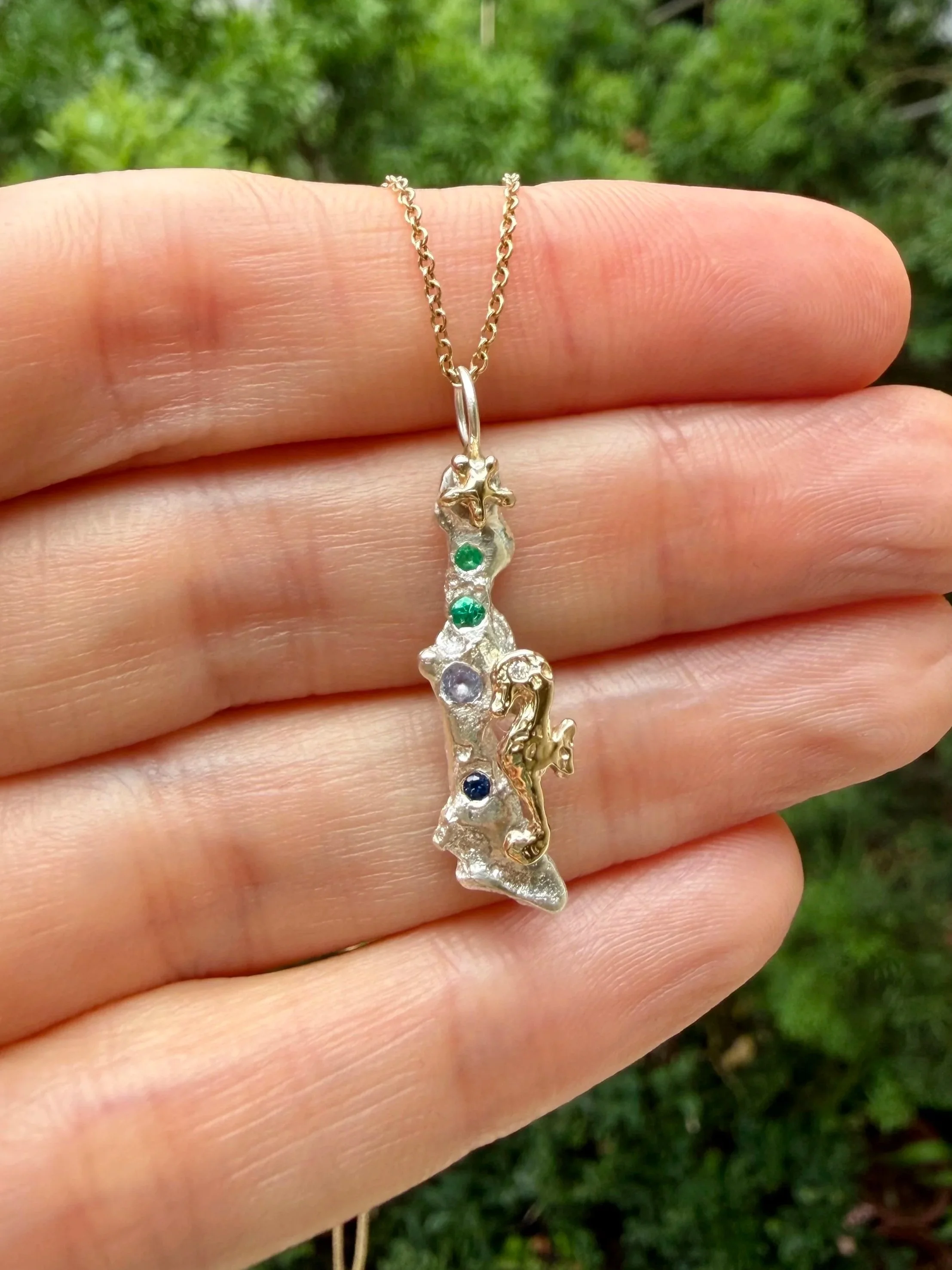 The Coral Branches are more than just a pendant. They are conversation pieces hand carved and “sand cast” with recycled sterling silver to produce their unique shapes and sandy texture. The high polish 14k gold sea life and sparkling vibrant gemstones are a sweet contrast to the textured silver, and evoke a rich diversity of ocean life that depends on coral reefs for shelter and food. Over time, the sterling silver coral will oxidize to the individual wearer, creating a striking visual contrast to the bright 14k gold elements.