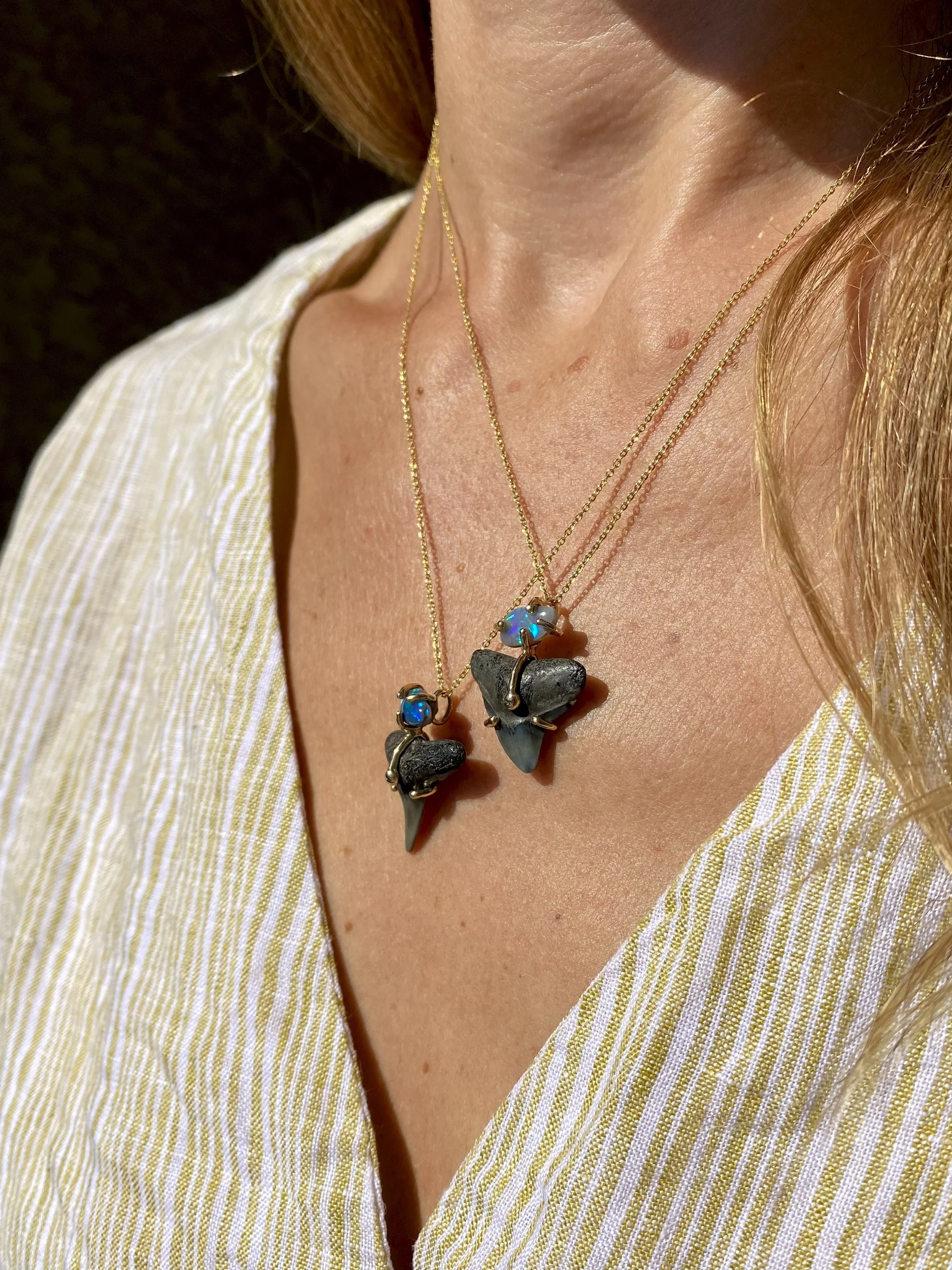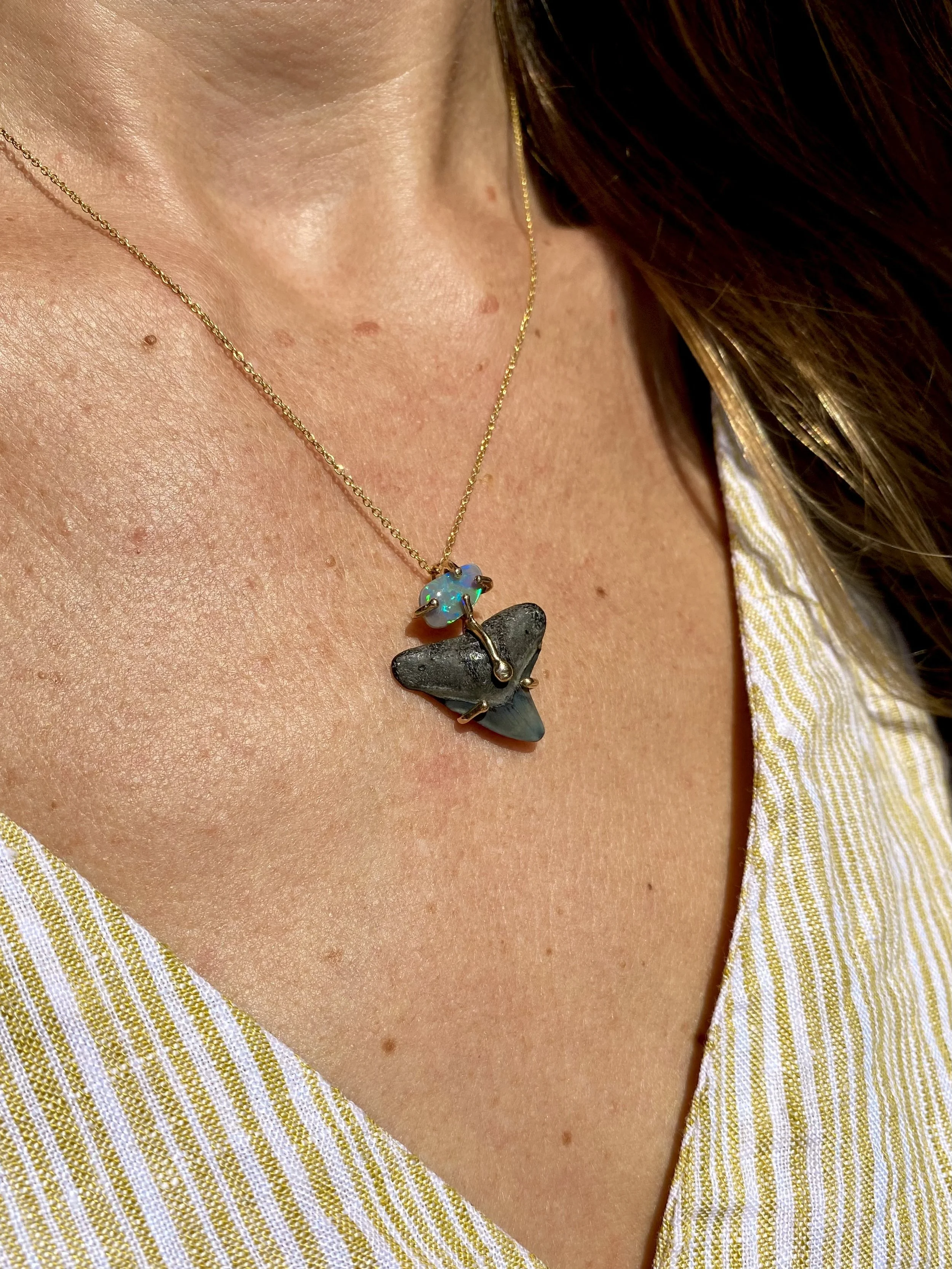 Sale is for one pendant in 14k yellow gold, naturally found fossilized shark tooth, and Australian opal. Marked down to re-work the design. Sale items are sold as-is, no refunds or exchanges.