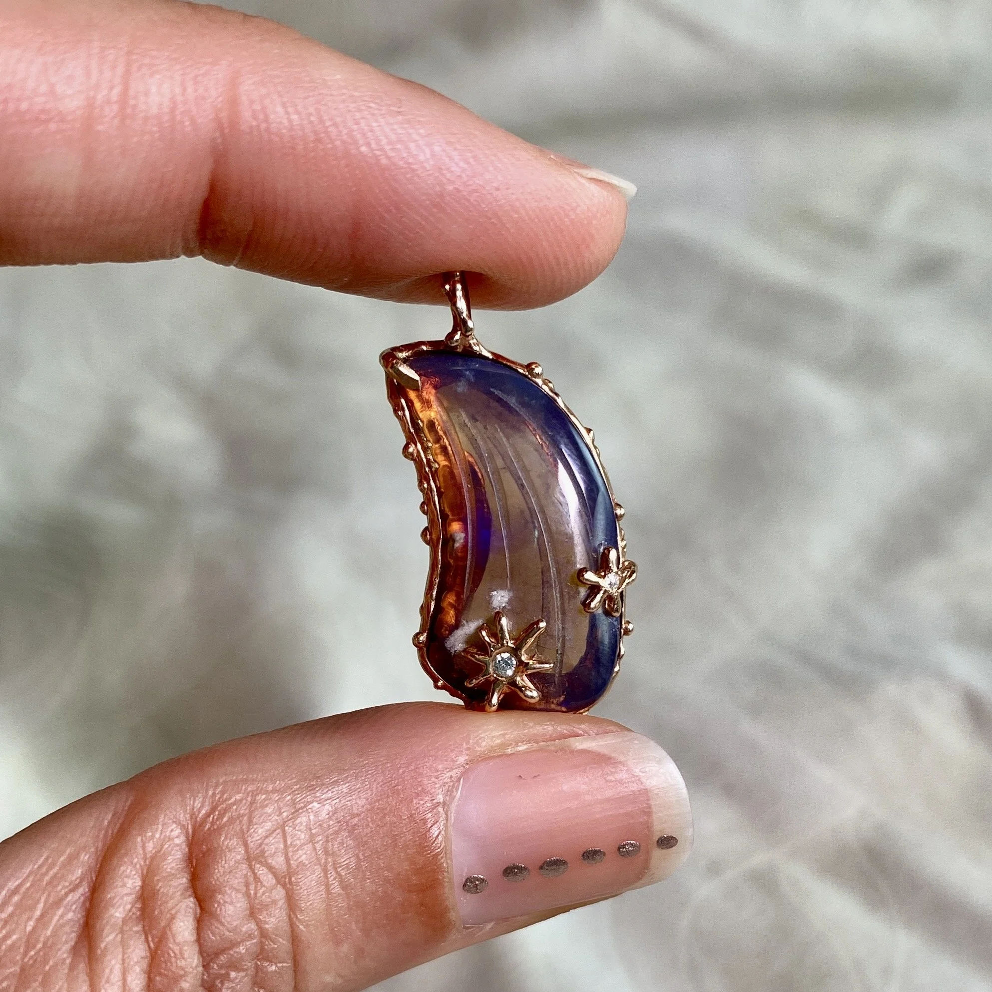 An Australian opal carved into the shape of a shark fin is held in a hand carved 14k rose gold bubbly setting with bright white diamonds set into the starfish & barnacle style prongs. The partially translucent opal glows the prettiest purple as if you're going for a twilight swim, a sweet pairing with the rose gold setting. The ultimate protection amulet for all ocean lovers!